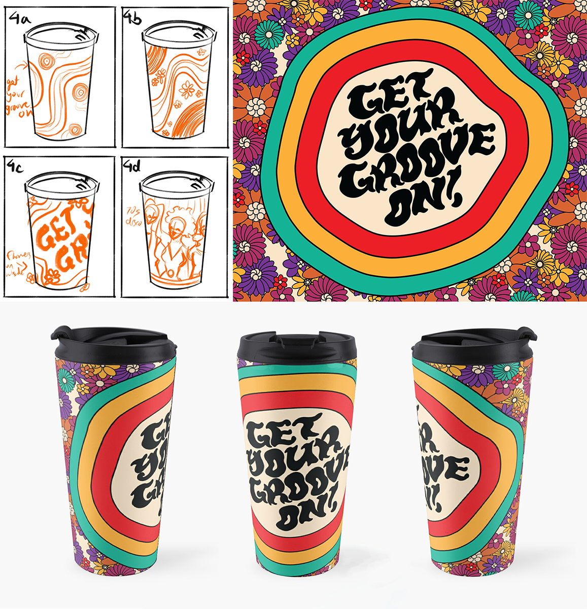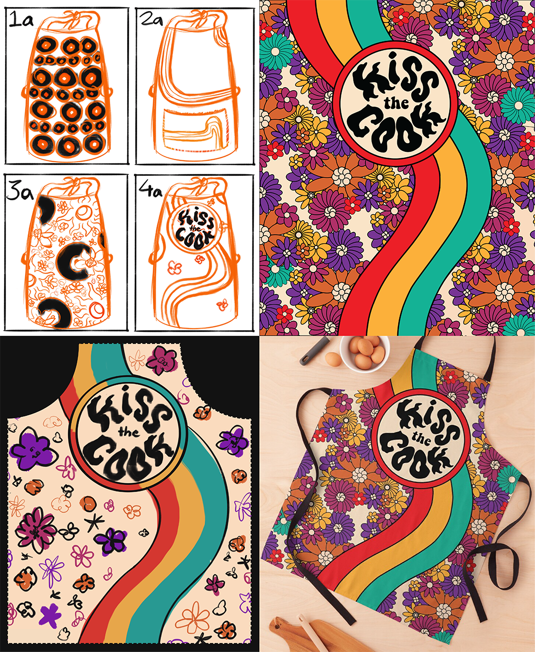 The objects I had to create illustrations for were a clock, apron, bed comforter, travel mug, and a backpack. After getting feedback from my creative peers on which of my ideas would be best to move forward with, I solidified my color palette for my illustrations and did colored sketches. I then got feedback on color choices and revised before creating my final artworks. Experimenting with placement and pattern on the products was a great experience since I was able to see how it could change the feeling of the final work, and influence who would be interested in purchasing it.