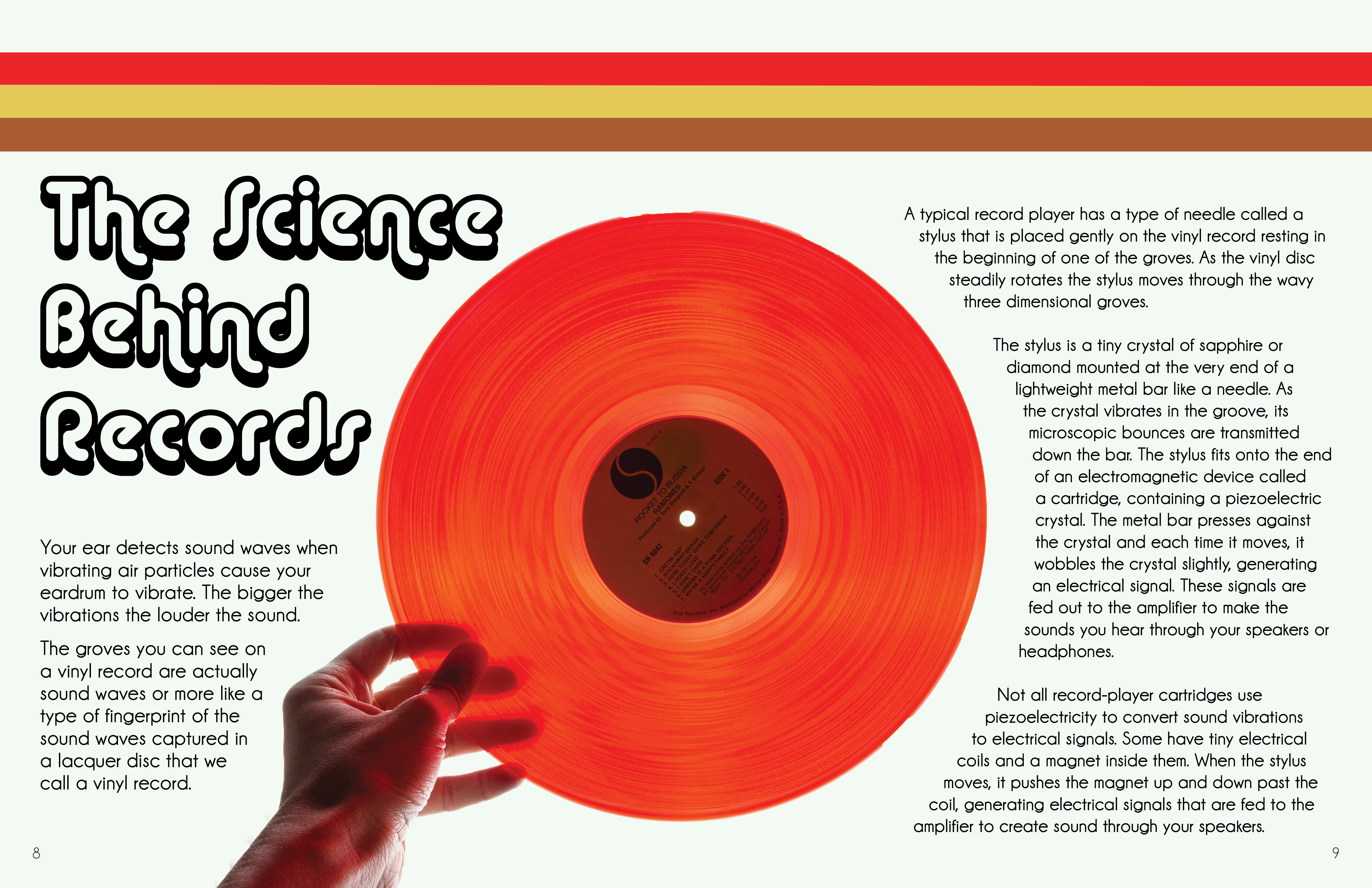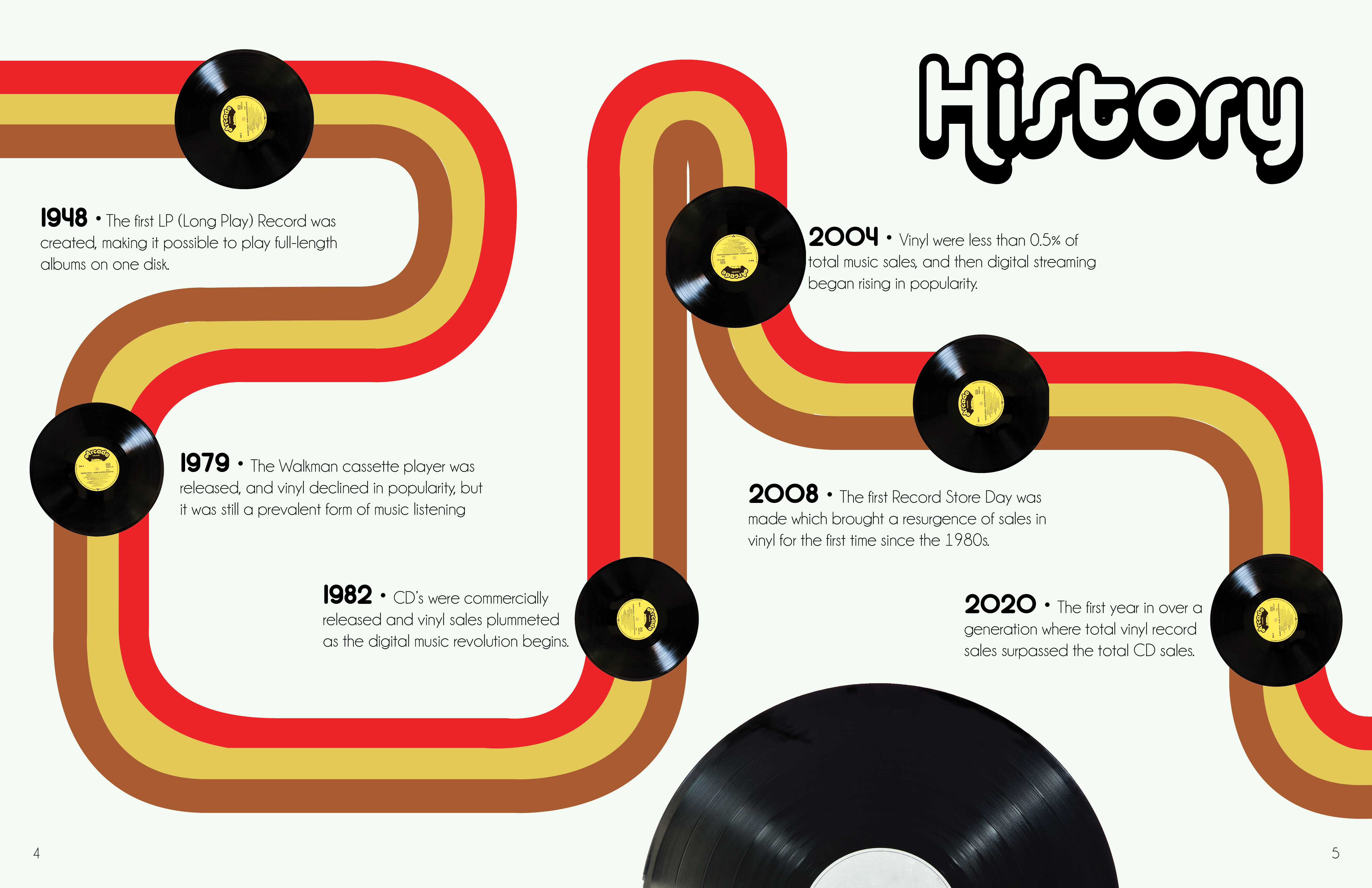 I think my favorite part of the project was working on the page about “the science behind records”. Creating the type that wraps around the vinyl image was probably the most enjoyable part of the digitizing process. Also, I enjoyed playing around with the stripe on the history page, seeing how I could make the text interact with the shape and direction of the lines, and what made the most sense to the average audience member.