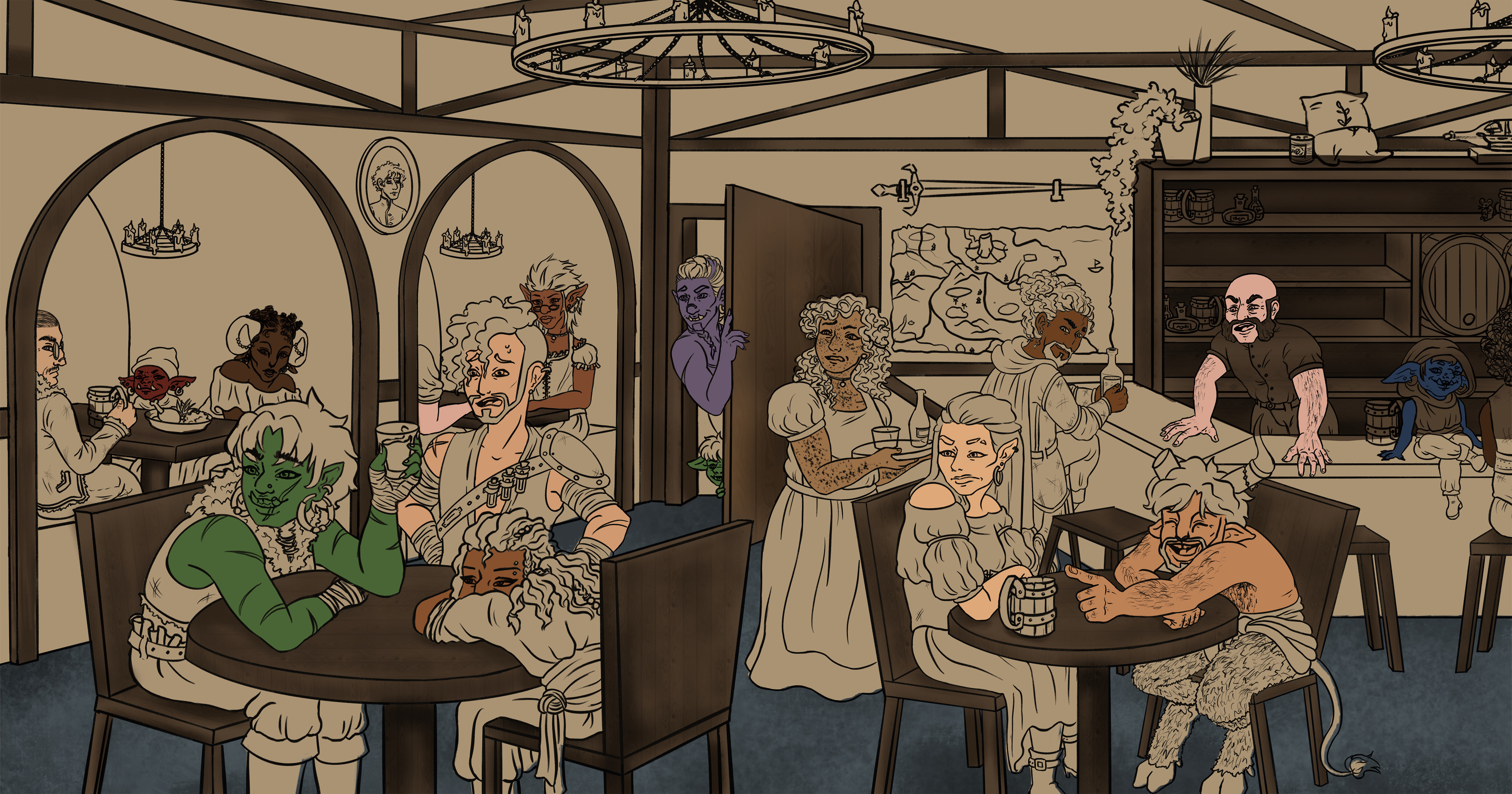 After I cemented my idea to go forward with a tavern, I created a rough sketch for each of the elements: the figures, the tables and chairs, and the background. After getting feedback from my peers, I added more detail into my environment by adding chandeliers, and framing on the walls. Moving into line art, I added more detail to the bar with more objects and took away some from the foreground to help the composition’s implied line. Coloring this was probably my favorite part, seeing each of the characters come to life through their color palettes added so much to the final composition.